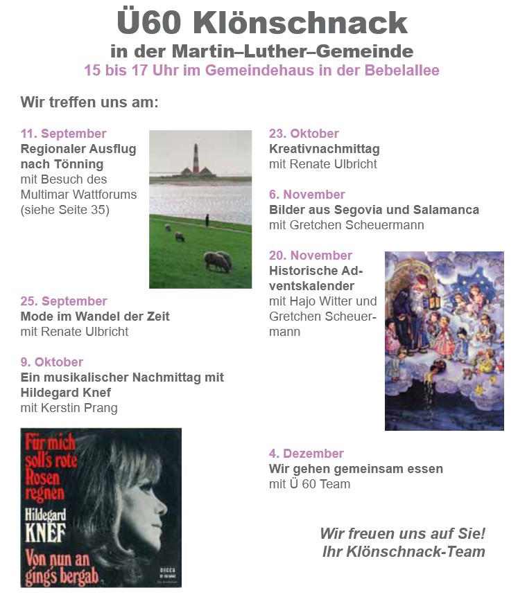 Ein Team aus Ehrenamtlichen leitet diese Nachmittage. Zum Jahresprogramm gehören Feste und Ausfahrten in Kooperation mit der Arbeitsstelle „Leben im Alter“ in unserer Region Alsterbund.